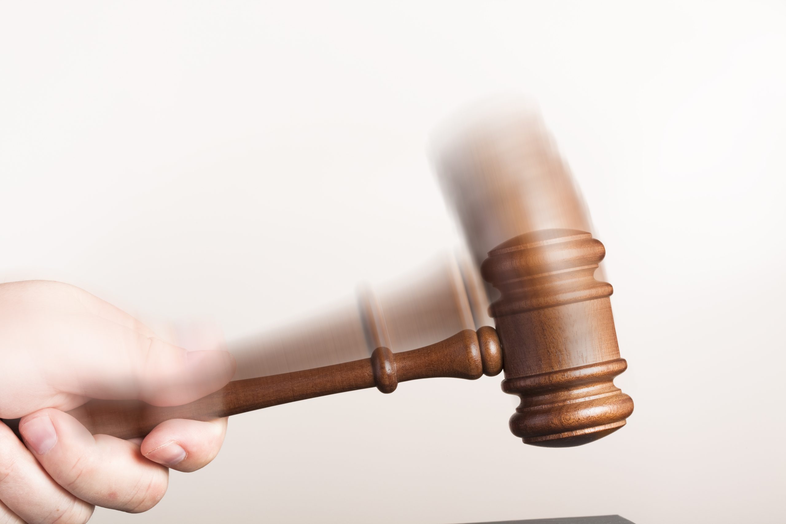 Hand hitting a sound box with gavel. Slow motion. White background.