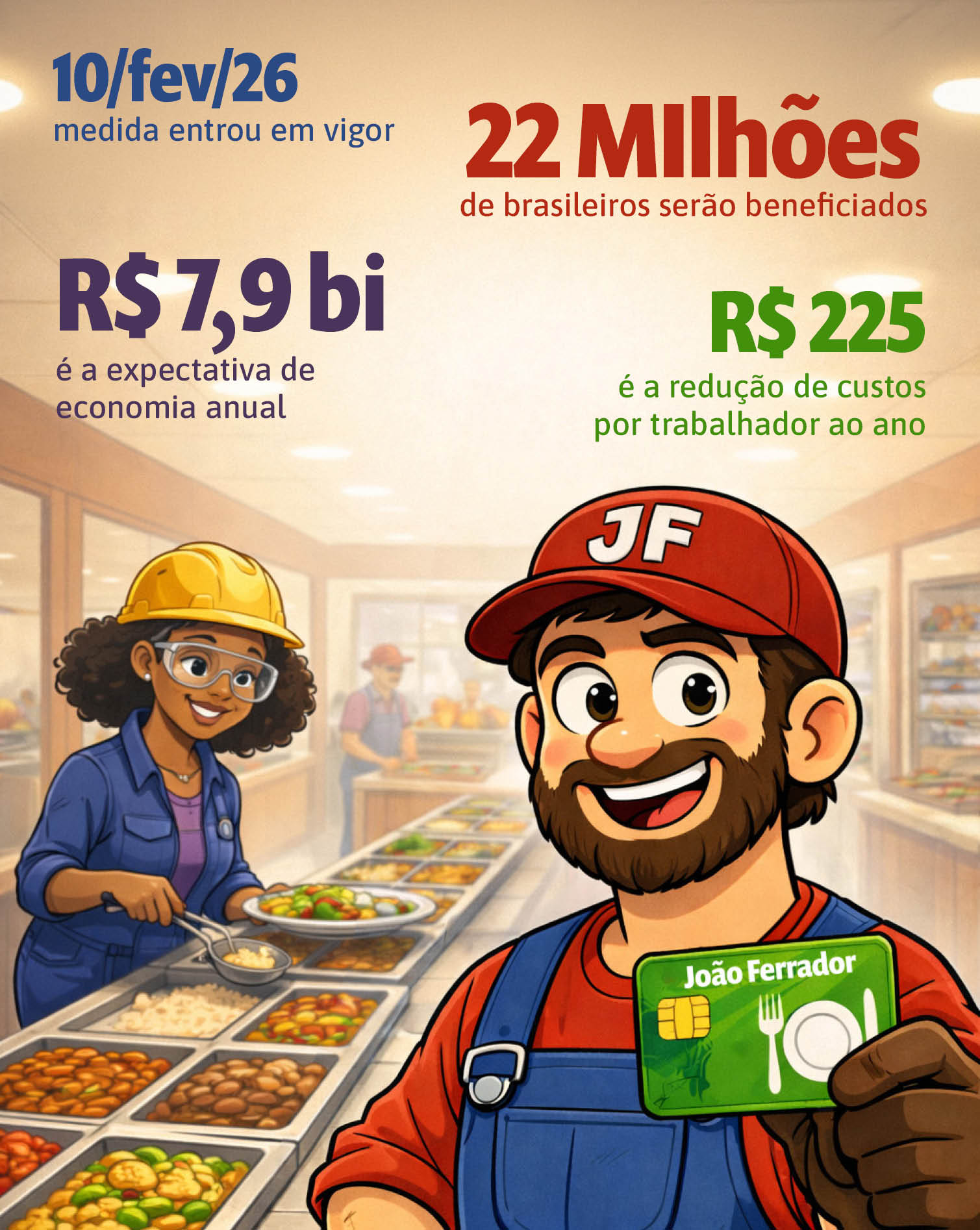 A mudança tem como base o Decreto 12.712, assinado pelo presidente Lula em novembro passado, que altera o PAT (Programa de Alimentação do Trabalhador) para ampliar a transparência e a concorrência no setor. A expectativa da Secretaria de Reformas Econômicas do Ministério da Fazenda é que o novo modelo gere uma economia anual de R$ 7,9 bilhões. Na prática, isso representa uma redução de custos de aproximadamente R$ 225 por trabalhador ao ano, fruto da maior competitividade entre as operadoras e da queda das taxas impostas aos estabelecimentos.